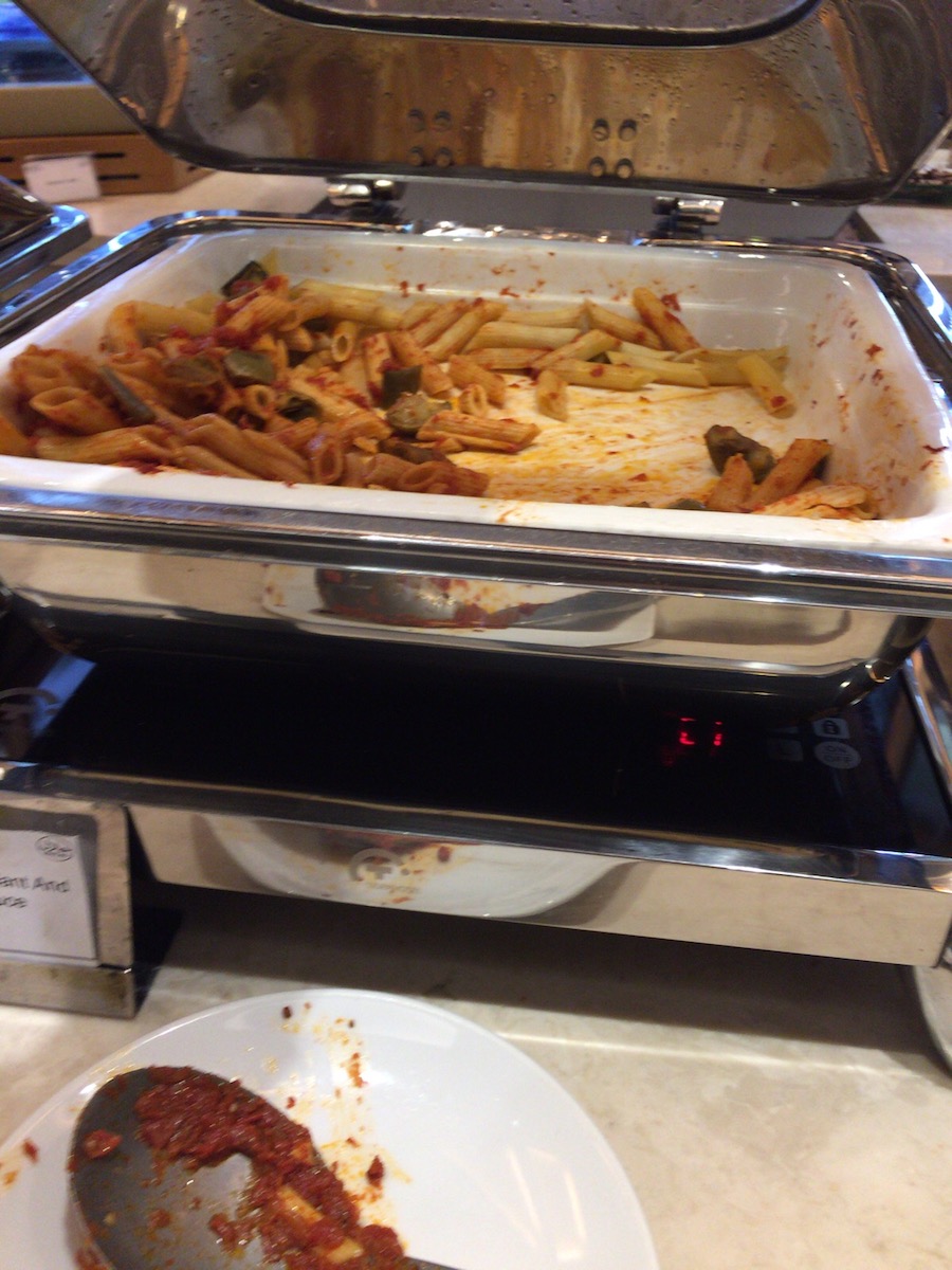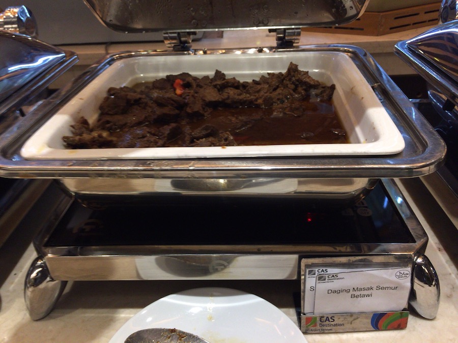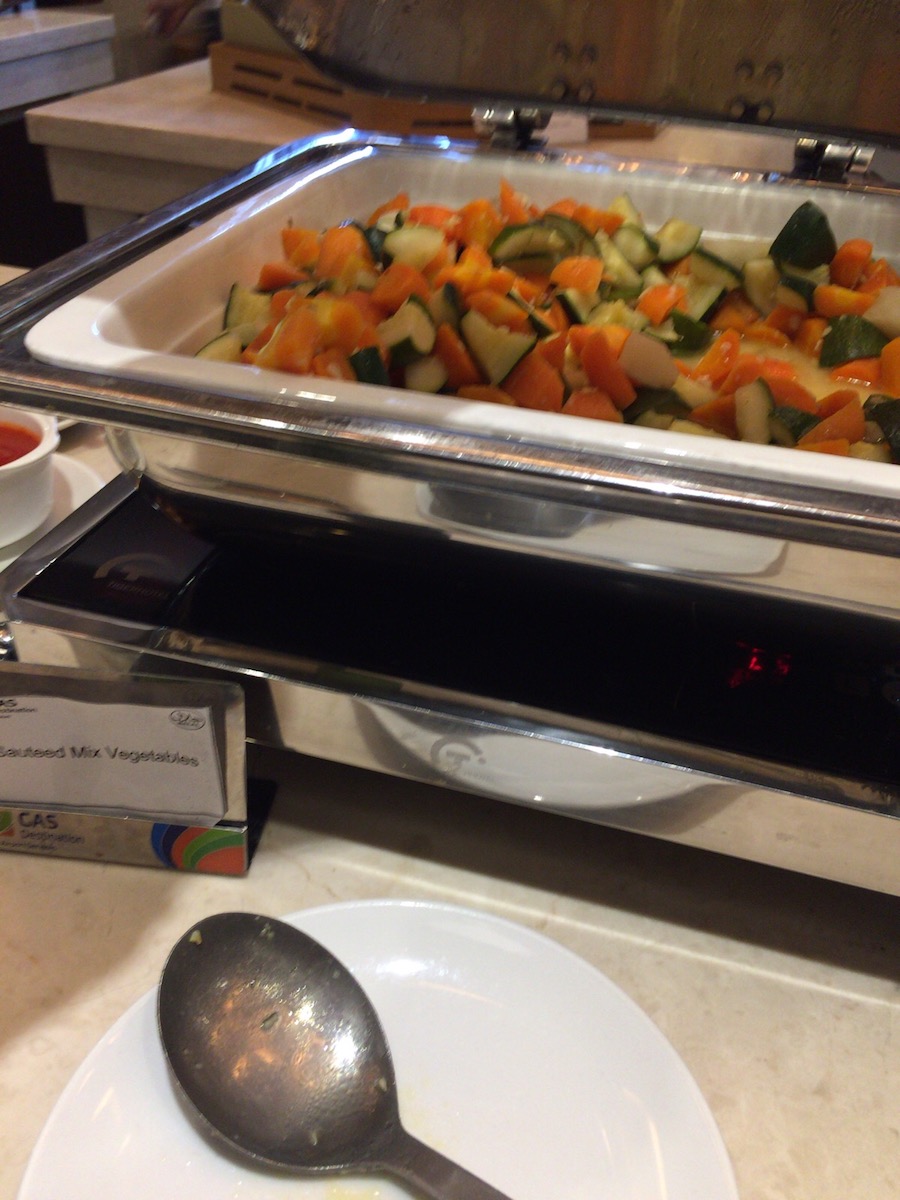 軽食類は割と充実しており、肉類、パスタ類、茹でた野菜などがあります。味付けは、インドネシア料理風の味付けですが、辛すぎるということはありませんでした。また、以前訪問した際はカレーを提供していた時もあり美味しかったですよ。