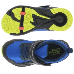 アウトソールは、スーパースターシリーズ定番の「バネの力(=上の画像のつま先のオレンジの部分))を使ったソールになっており耐久性のあるラバー素材部分も多いです。また、紐に見える部分はゴム紐なので、ベルトで止められるため、小さい子にも履きやすい設計です。